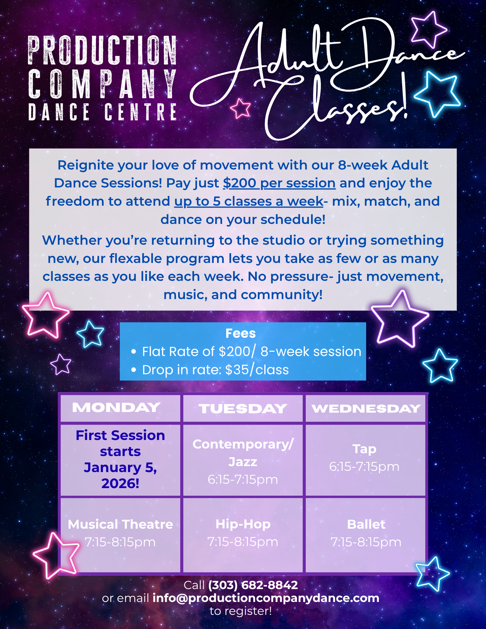 For more information or questions, email us at info@productioncompanydance.com or call (303) 682-8842 — we’d love to help you get started!